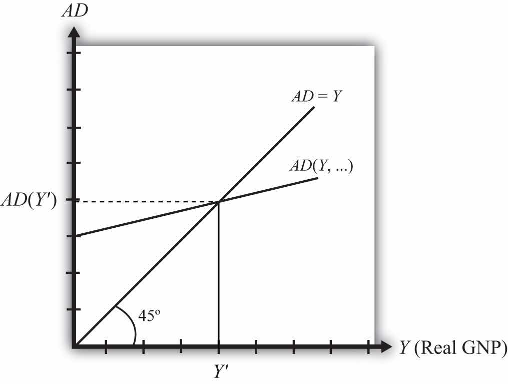 The Keynesian cross diagramDepicts the equilibrium level of national income in the G&S market model. depicts the equilibrium level of national income in the G&S market model. We begin with a plot of the aggregate demand function with respect to real GNP (Y) in Figure 8.1 "Aggregate Demand Function". Real GNP (Y) is plotted along the horizontal axis, and aggregate demand is measured along the vertical axis. The aggregate demand function is shown as the upward sloping line labeled AD(Y, …). The (…) is meant to indicate that AD is a function of many other variables not listed. There are several important assumptions about the form of the AD function that are needed to assure an equilibrium. We discuss each assumption in turn.