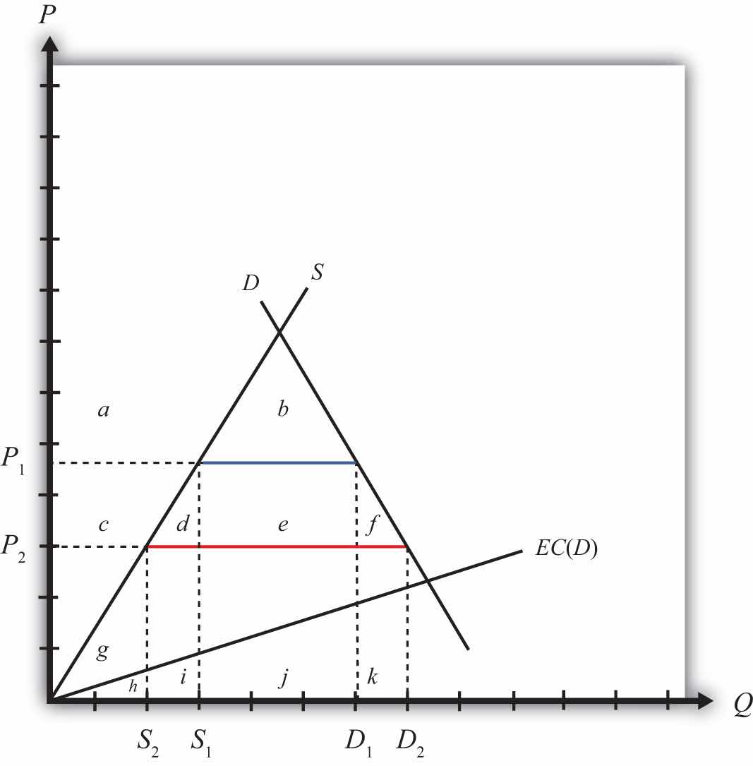 Consumers of gasoline lose from the higher price by the area (c + d + e + f). Domestic producers are unaffected because their price does not change. The government also collects tax revenue, given by (c + d + e), which is the product of the consumption tax (t = P1 − P2) and the level of consumption (D1). The net total efficiency losses from trade are given by the area (f). However, the presence of the environmental consumption externality means there is an additional benefit caused by the reduced pollution. This benefit is represented by the area k.