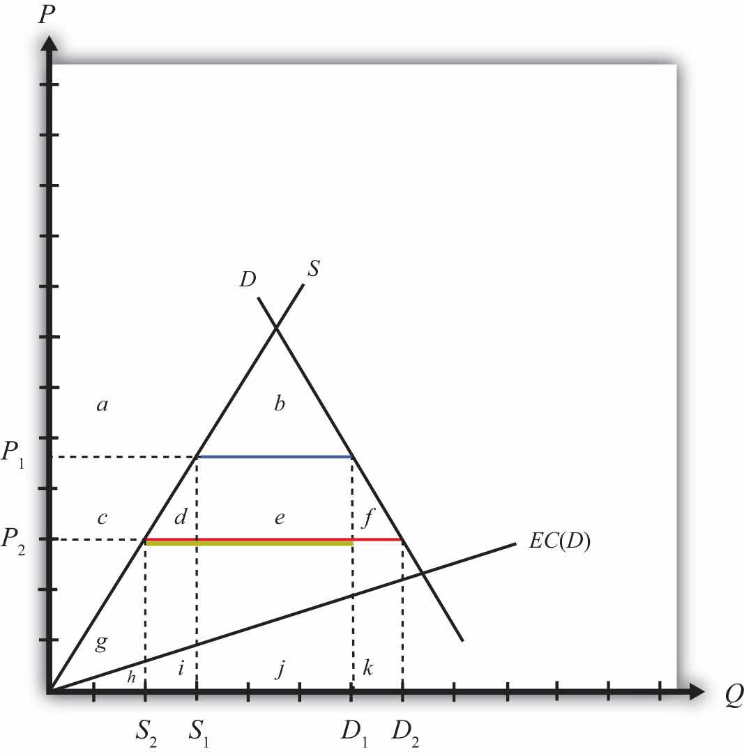 Next, suppose that a consumption tax, t = P1 − P2, is imposed instead of a tariff. Refer to Figure 9.9 "Tariff Effects and Environmental Costs". The tax will raise the consumer’s price to P1 but will leave the producer’s price at P2. Domestic producers will not be affected by the consumption tax since continued competition in free trade with firms in the rest of the world will maintain their profit-maximizing price at the world price of P2. The price changes will cause domestic demand for gasoline to fall to D1, but supply will remain at S2. Imports will fall to (D1 − S2) (the yellow line). The welfare effects of the consumption tax are presented in Table 9.15 "Welfare Effects of a Domestic Consumption Tax with a Negative Environmental Consumption Externality". The letters refer to the area in Figure 9.9 "Tariff Effects and Environmental Costs".