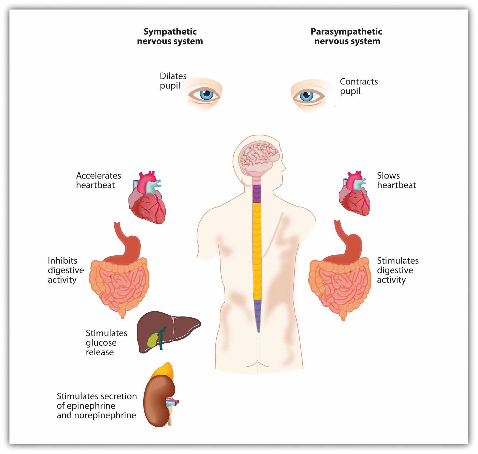 Our everyday activities are controlled by the interaction between the sympathetic and parasympathetic nervous systems. For example, when we get out of bed in the morning, we would experience a sharp drop in blood pressure if it were not for the action of the sympathetic system, which automatically increases blood flow through the body. Similarly, after we eat a big meal, the parasympathetic system automatically sends more blood to the stomach and intestines, allowing us to efficiently digest the food. And perhaps you’ve had the experience of not being at all hungry before a stressful event, such as a sports game or an exam (when the sympathetic division was primarily in action), but suddenly finding yourself starved afterward, as the parasympathetic takes over. The two systems work together to maintain vital bodily functions, resulting in homeostasisThe natural balance in the body’s systems., the natural balance in the body’s systems.