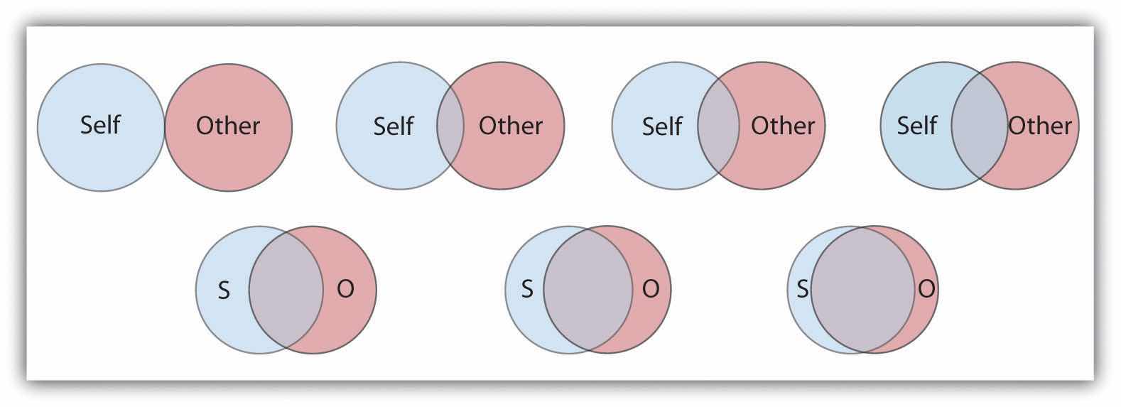 In the most successful relationships the two people begin to see themselves as a single unit. Arthur Aron and his colleagues (Aron, Aron, & Smollan, 1992)Aron, A., Aron, E. N., & Smollan, D. (1992). Inclusion of other in the self scale and the structure of interpersonal closeness. Journal of Personality & Social Psychology, 63(4), 596–612. assessed the role of closeness in relationships using the Inclusion of Other in the Self Scale as shown in Figure 14.6 "The Inclusion of Other in the Self Scale". You might try completing the measure yourself for some different people that you know—for instance, your family members, friends, spouse, or girlfriend or boyfriend. The measure is simple to use and to interpret; if people see the circles representing the self and the other as more overlapping, this means that the relationship is close. But if they choose the circles that are less overlapping, then the relationship is less so.