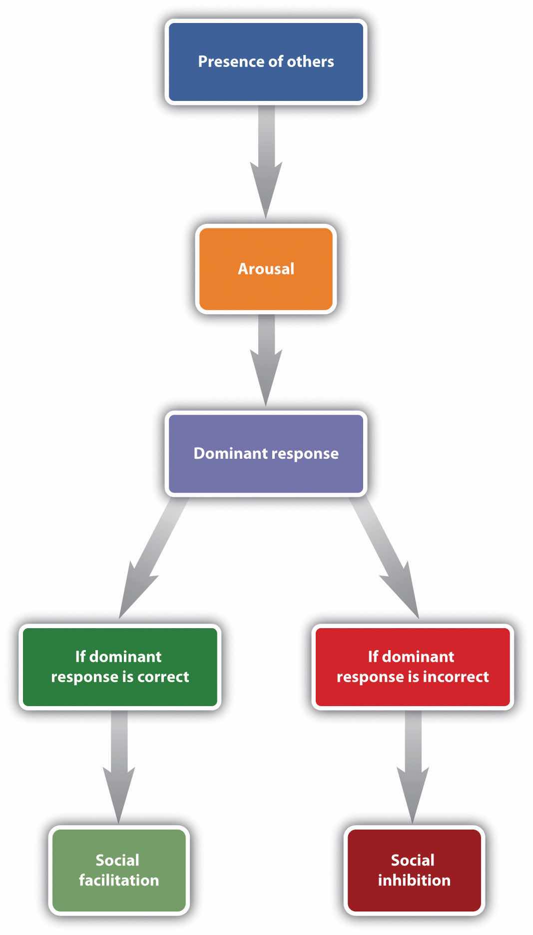 Robert Zajonc (1965)Zajonc, R. B. (1965). Social facilitation. Science, 149, 269–274. explained the observed influence of others on task performance using the concept of physiological arousal. According to Zajonc, when we are with others we experience more arousal than we do when we are alone, and this arousal increases the likelihood that we will perform the dominant response, the action that we are most likely to emit in any given situation (Figure 14.15 "Drive-Arousal Model of Social Facilitation").