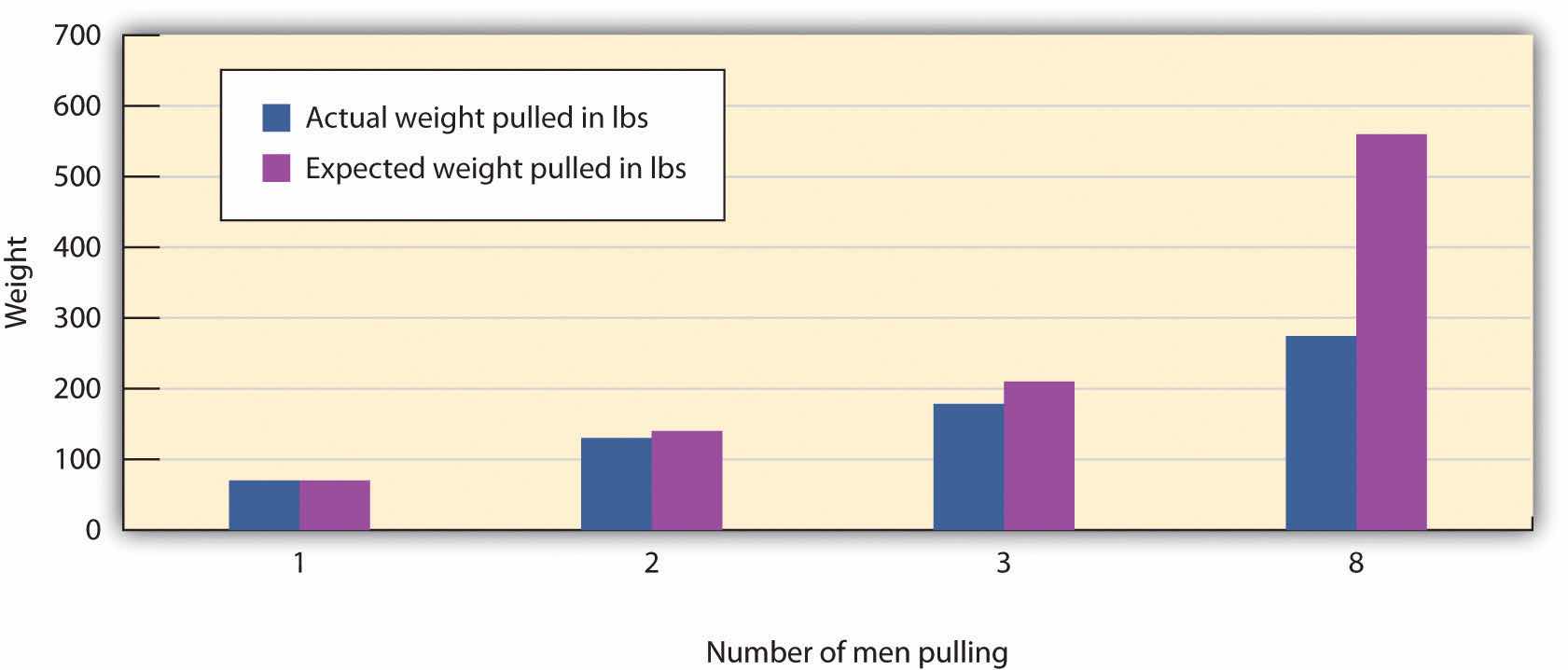 One group process loss that may occur in groups is that the group members may engage in social loafingA group process loss that occurs when people do not work as hard in a group as they do when they are working alone., a group process loss that occurs when people do not work as hard in a group as they do when they are working alone. In one of the earliest social psychology experiments, Ringelmann (1913; reported in Kravitz & Martin, 1986)Kravitz, D. A., & Martin, B. (1986). Ringelmann rediscovered: The original article. Journal of Personality and Social Psychology, 50, 936–941. had individual men, as well as groups of various numbers of men, pull as hard as they could on ropes while he measured the maximum amount that they were able to pull. As you can see in Figure 14.16 "Group Process Loss", although larger groups pulled harder than any one individual, Ringelmann also found a substantial process loss. In fact, the loss was so large that groups of three men pulled at only 85% of their expected capability, whereas groups of eight pulled at only 37% of their expected capability. This type of process loss, in which group productivity decreases as the size of the group increases, has been found to occur on a wide variety of tasks.