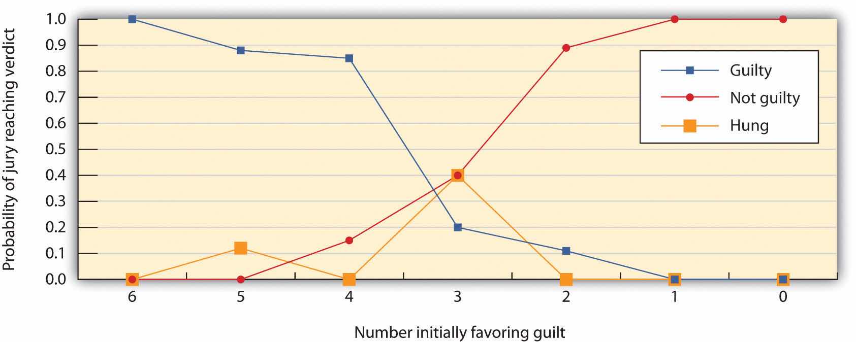 This figure shows the decisions of 6-member mock juries that made “majority rules” decisions. When the majority of the 6 initially favored voting guilty, the jury almost always voted guilty; when the majority of the 6 initially favored voting innocent, the jury almost always voted innocent. The juries were frequently hung (could not make a decision) when the initial split was 3–3.