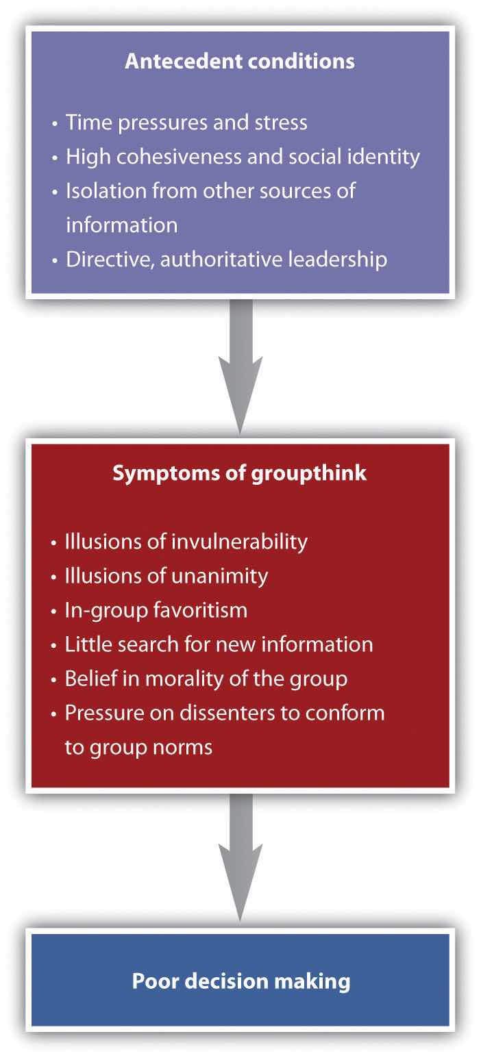 Group process losses can also occur when group members conform to each other rather than expressing their own divergent ideas. GroupthinkAn outcome that occurs when a group, as a result of a flawed group process and strong conformity pressures, makes a very poor decision. is a phenomenon that occurs when a group made up of members who may be very competent and thus quite capable of making excellent decisions nevertheless ends up, as a result of a flawed group process and strong conformity pressures, making a poor decision (Baron, 2005; Janis, 2007).Baron, R. S. (2005). So right it’s wrong: Groupthink and the ubiquitous nature of polarized group decision making. In M. P. Zanna (Ed.), Advances in experimental social psychology (Vol. 37, pp. 219–253). San Diego, CA: Elsevier Academic Press; Janis, I. L. (2007). Groupthink. In R. P. Vecchio (Ed.), Leadership: Understanding the dynamics of power and influence in organizations (2nd ed., pp. 157–169). Notre Dame, IN: University of Notre Dame Press. Groupthink is more likely to occur in groups whose members feel a strong group identity, when there is a strong and directive leader, and when the group needs to make an important decision quickly. The problem is that groups suffering from groupthink become unwilling to seek out or discuss discrepant or unsettling information about the topic at hand, and the group members do not express contradictory opinions. Because the group members are afraid to express opinions that contradict those of the leader, or to bring in outsiders who have other information, the group is prevented from making a fully informed decision. Figure 14.17 "Causes and Outcomes of Groupthink" summarizes the basic causes and outcomes of groupthink.