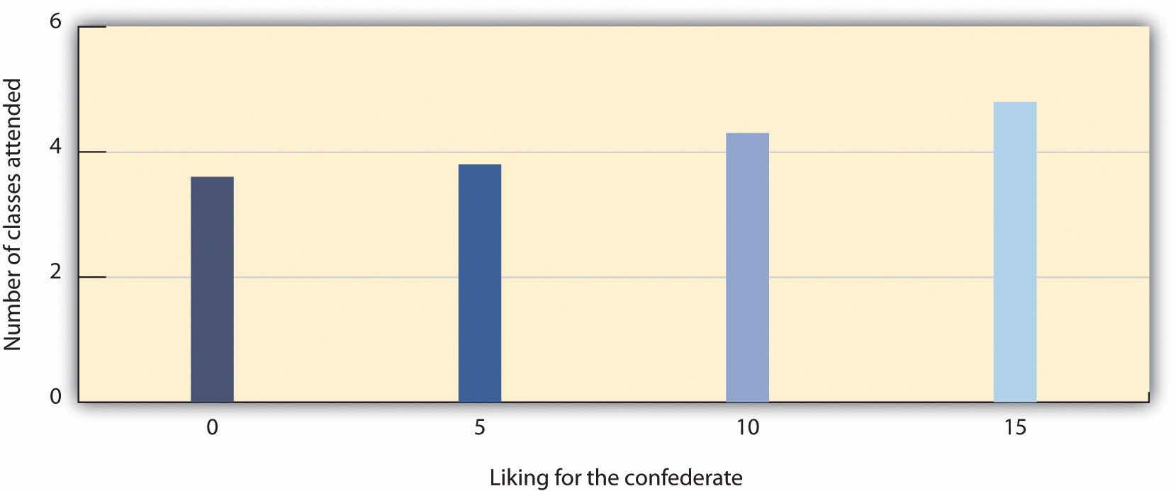 Proximity has its effect on liking through the principle of mere exposureThe tendency to prefer stimuli (including but not limited to people) that we have seen more frequently., which is the tendency to prefer stimuli (including but not limited to people) that we have seen more frequently. Moreland and Beach (1992)Moreland, R. L., & Beach, S. R. (1992). Exposure effects in the classroom: The development of affinity among students. Journal of Experimental Social Psychology, 28(3), 255–276. studied mere exposure by having female confederates attend a large lecture class of over 100 students 0, 5, 10, or 15 times during a semester. At the end of the term, the other students in the class were shown pictures of the confederates and asked to indicate both if they recognized them and also how much they liked them. The number of times the confederates had attended class didn’t influence the other students’ ability to recognize them, but it did influence their liking for them. As predicted by the mere exposure hypothesis, students who had attended class more often were liked more (Figure 14.5 "Mere Exposure in the Classroom").