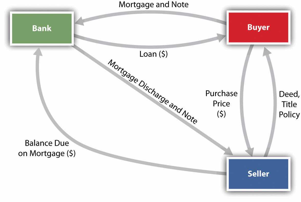 Despite all these transactions, the critical players are the seller, the purchaser, and the bank. To place the closing process in perspective, assume that one bank holds the existing (seller’s) mortgage on the property and is also financing the buyer’s purchase. We can visualize the three main players sitting at a table, ready to close the transaction. The key documents and the money will flow as illustrated in Figure 12.2 "Closing Process".