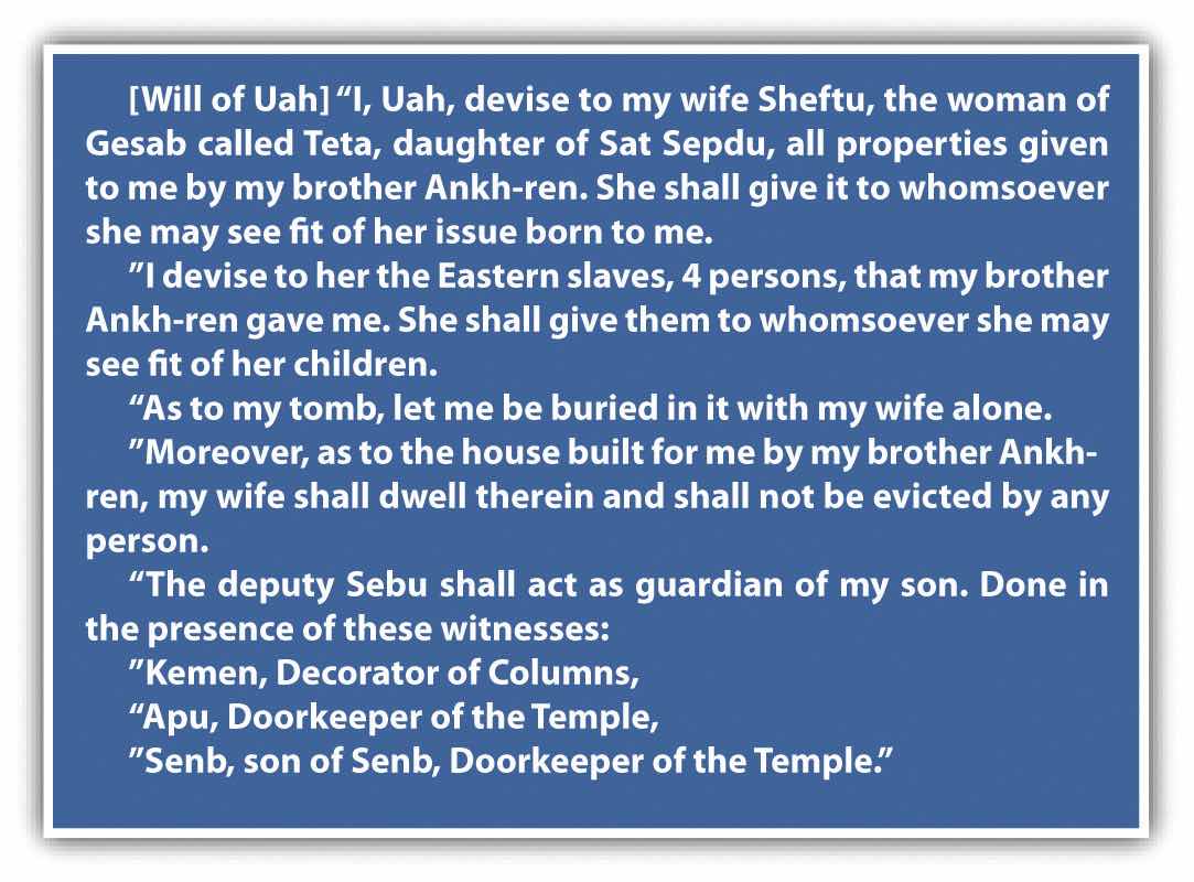 A willThe declaration of a person’s wishes (the testator) about the disposition of his assets on his death. is the declaration of a person’s wishes about the disposition of his assets on his death. Normally a written document, the will names the persons who are to receive specific items of real and personal property. Unlike a contract or a deed, a will is not binding as long as the person making the will lives. He may revoke it at any time. Wills have served their present function for virtually all of recorded history. The earliest known will is from 1800 BC (see Figure 14.2 "An Ancient Will"). Even if somewhat different in form, it served the same basic function as a modern will.