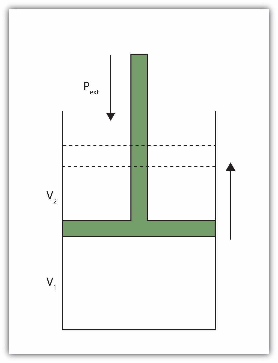 When a certain volume of a gas expands, it works against an external pressure to expand (Figure 7.2 "Volume versus Pressure"). That is, the gas must perform work. Assuming that the external pressure Pext is constant, the amount of work done by the gas is given by the equation