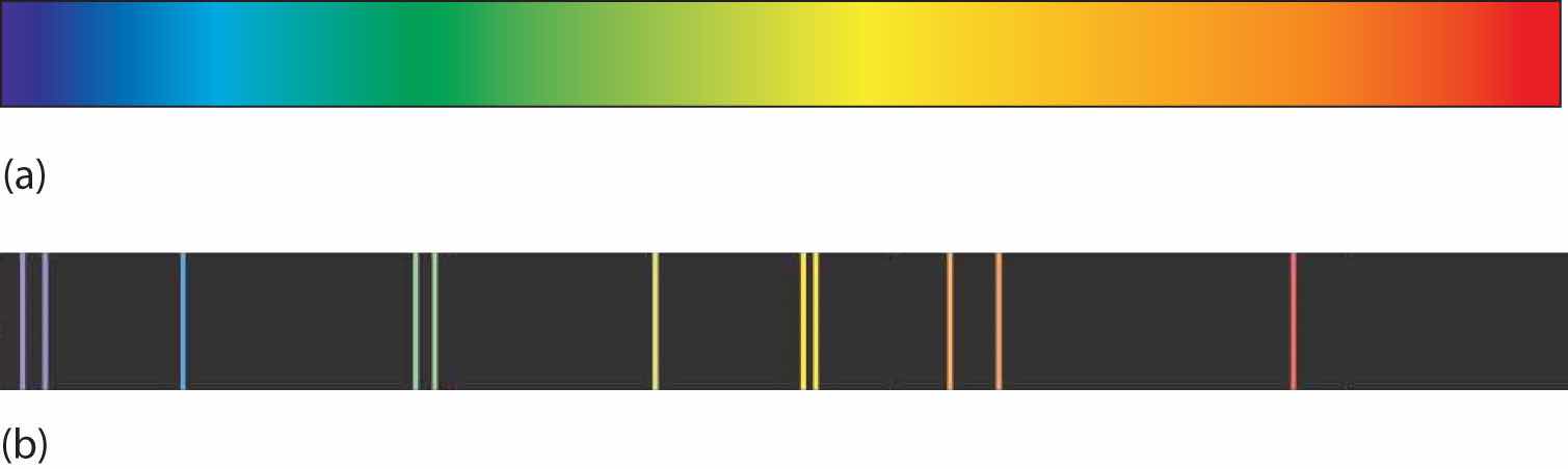 A hot object gives off a continuum of light. We notice this when the visible portion of the electromagnetic spectrum is passed through a prism: the prism separates light into its constituent colors, and all colors are present in a continuous rainbow (part (a) in Figure 8.3 "Prisms and Light"). This image is known as a continuous spectrumAn image that contains all colors of light.. However, when electricity is passed through a gas and light is emitted and this light is passed though a prism, we see only certain lines of light in the image (part (b) in Figure 8.3 "Prisms and Light"). This image is called a line spectrumAn image that contains only certain colors of light.. It turns out that every element has its own unique, characteristic line spectrum.