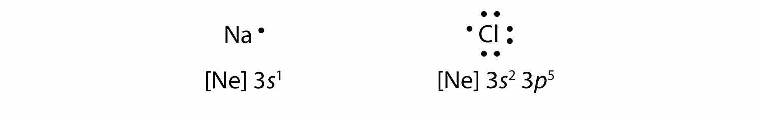 Now consider an Na atom in the presence of a Cl atom. The two atoms have these Lewis electron dot diagrams and electron configurations: