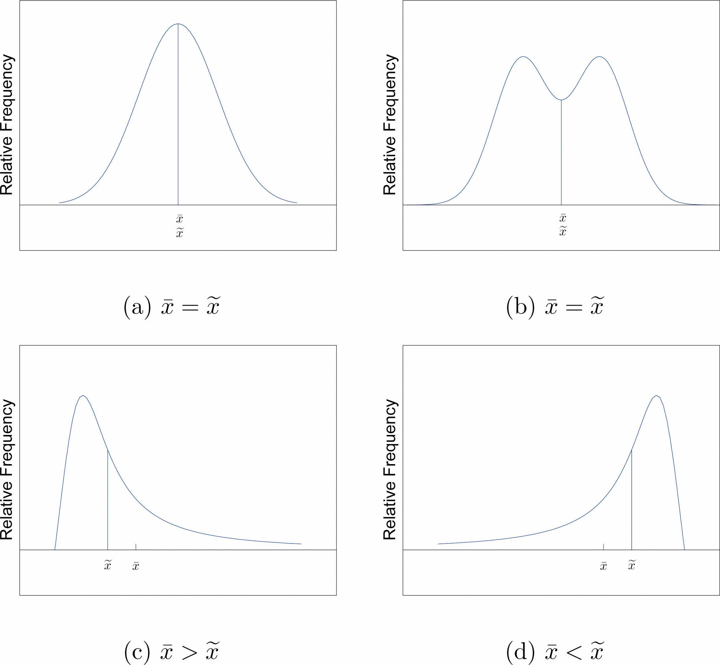 The relationship between the mean and the median for several common shapes of distributions is shown in Figure 2.8 "Skewness of Relative Frequency Histograms". The distributions in panels (a) and (b) are said to be symmetric because of the symmetry that they exhibit. The distributions in the remaining two panels are said to be skewed. In each distribution we have drawn a vertical line that divides the area under the curve in half, which in accordance with Figure 2.7 "The Median" is located at the median. The following facts are true in general: