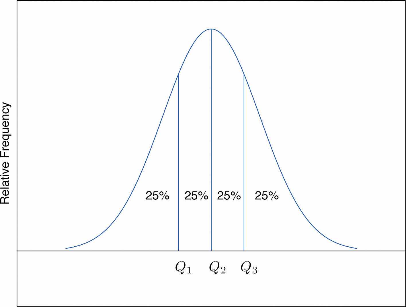 The Pth percentile cuts the data set in two so that approximately P% of the data lie below it and % of the data lie above it. In particular, the three percentiles that cut the data into fourths, as shown in Figure 2.12 "Data Division by Quartiles", are called the quartilesOf a data set, the three numbers , , that divide the data approximately into fourths.. The following simple computational definition of the three quartiles works well in practice.