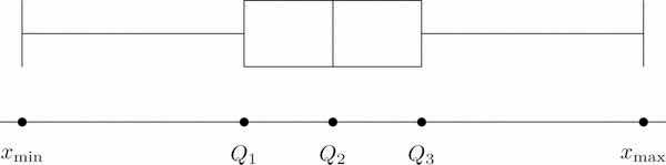The five-number summary is used to construct a box plotFor a data set, a diagram constructed using the five-number summary, as in Figure 2.13 "The Box Plot", which graphically summarizes the distribution of the data. as in Figure 2.13 "The Box Plot". Each of the five numbers is represented by a vertical line segment, a box is formed using the line segments at and as its two vertical sides, and two horizontal line segments are extended from the vertical segments marking and to the adjacent extreme values. (The two horizontal line segments are referred to as “whiskers,” and the diagram is sometimes called a “box and whisker plot.”) We caution the reader that there are other types of box plots that differ somewhat from the ones we are constructing, although all are based on the three quartiles.