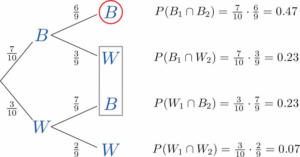 The numbers on the two leftmost branches are the probabilities of getting either a black marble, 7 out of 10, or a white marble, 3 out of 10, on the first draw. The number on each remaining branch is the probability of the event corresponding to the node on the right end of the branch occurring, given that the event corresponding to the node on the left end of the branch has occurred. Thus for the top branch, connecting the two Bs, it is , where B1 denotes the event “the first marble drawn is black” and B2 denotes the event “the second marble drawn is black.” Since after drawing a black marble out there are 9 marbles left, of which 6 are black, this probability is 6/9.