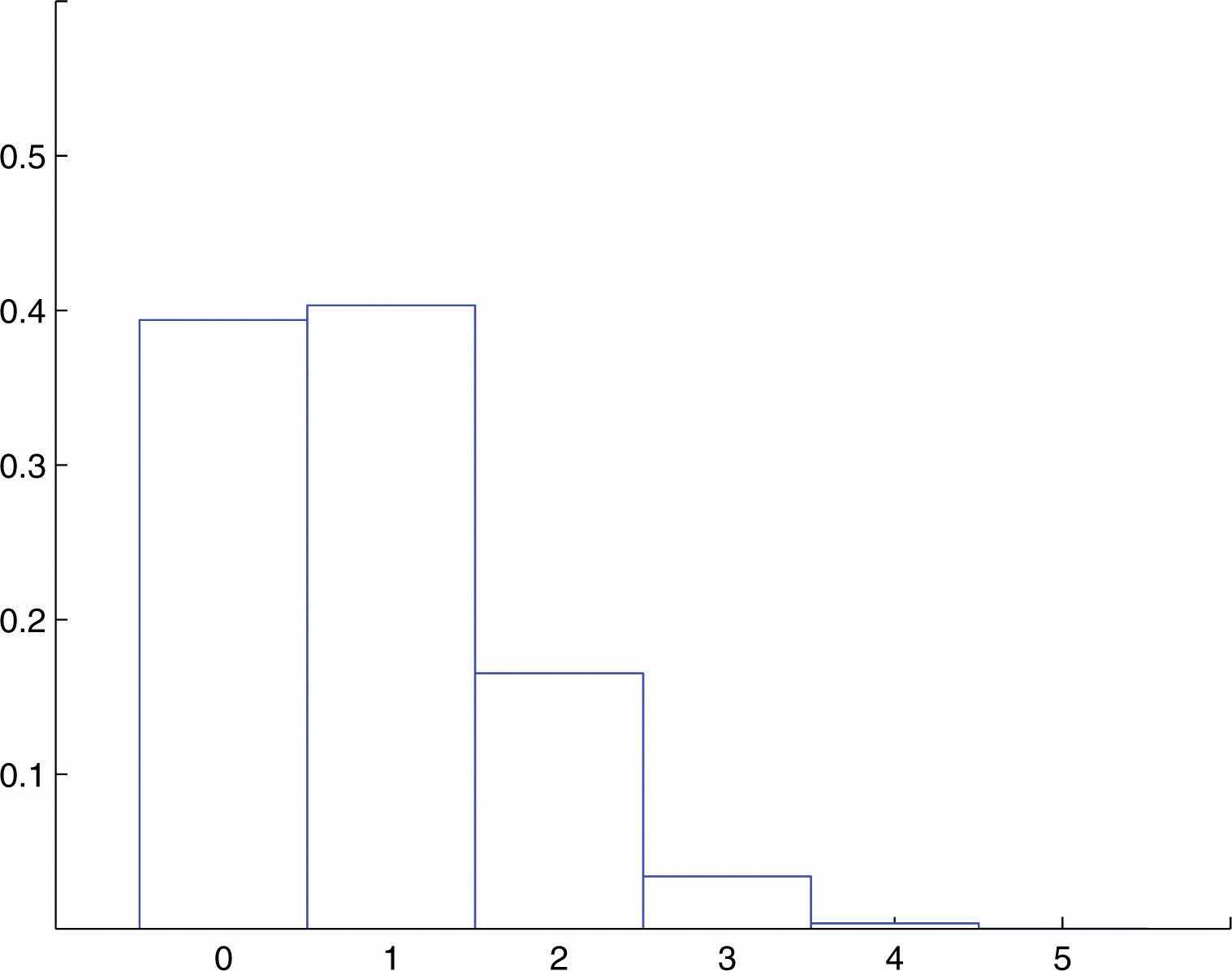 This probability distribution is represented by the histogram in Figure 4.5 "Probability Distribution of the Binomial Random Variable in ", which graphically illustrates just how improbable the events X = 4 and X = 5 are. The corresponding bar in the histogram above the number 4 is barely visible, if visible at all, and the bar above 5 is far too short to be visible.