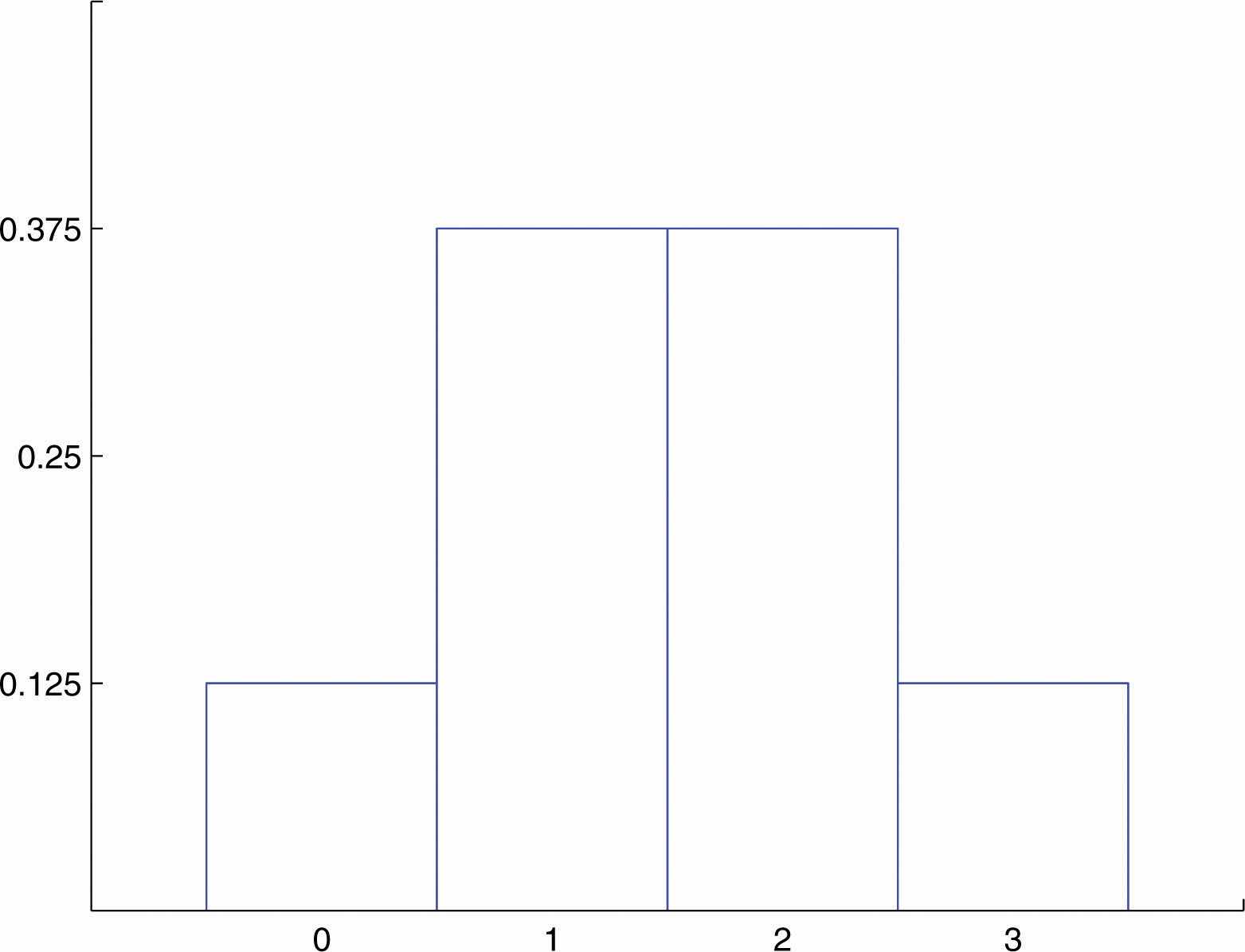 A histogram that graphically illustrates this probability distribution is given in Figure 4.4 "Probability Distribution for Three Coins and Three Children". What is common to the two experiments is that we perform three identical and independent trials of the same action, each trial has only two outcomes (heads or tails, boy or girl), and the probability of success is the same number, 0.5, on every trial. The random variable that is generated is called the binomial random variableA random variable that counts successes in a fixed number of independent, identical trials of a success/failure experiment. with parameters n = 3 and p = 0.5. This is just one case of a general situation.