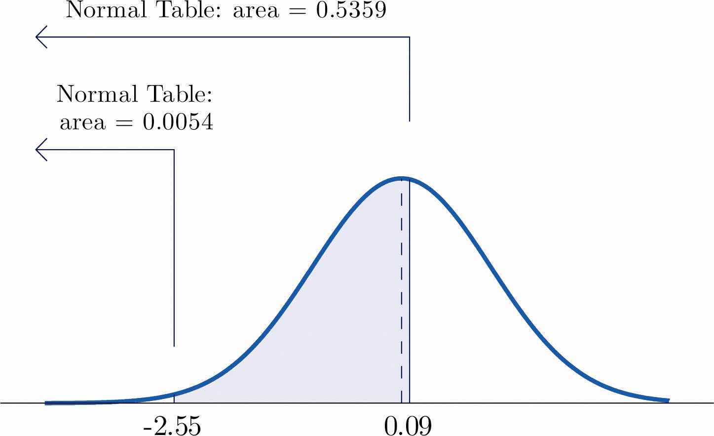 Similarly, here we can read directly from the table that the area under the density curve and to the left of 2.15 is 0.9842, but −5.22 is too far to the left on the number line to be in the table. We can see from the first line of the table that the area to the left of −5.22 must be so close to 0 that to four decimal places it rounds to 0.0000. Therefore