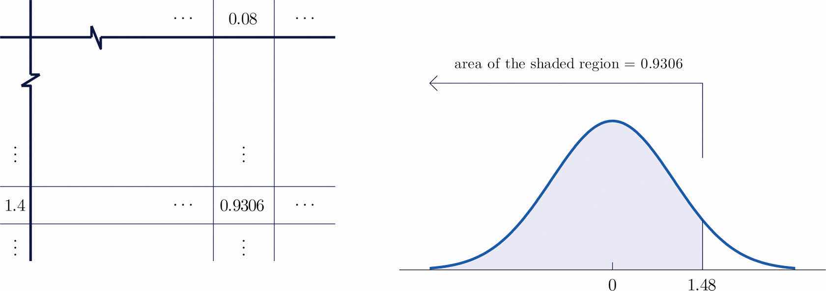 Since inclusion of the endpoint makes no difference for the continuous random variable Z, , which we know how to find from the table. The number in the row with heading 1.6 and in the column with heading 0.00 is 0.9452. Thus so