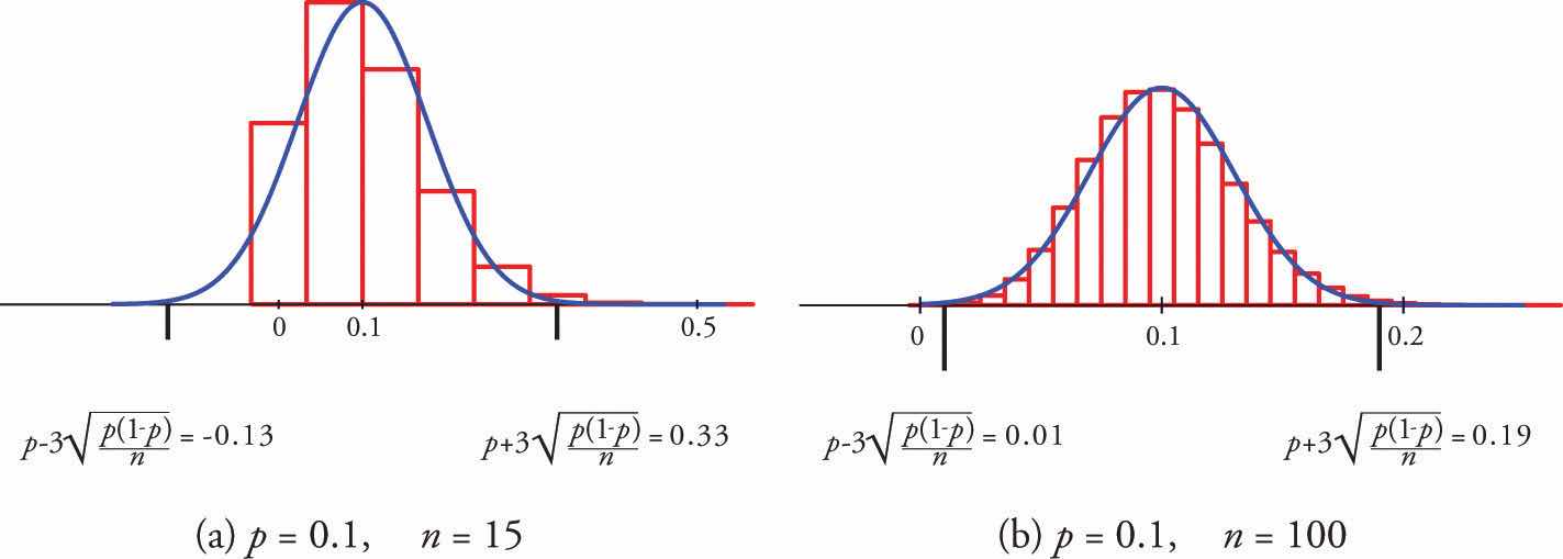 Figure 6.5 "Distribution of Sample Proportions" shows that when p = 0.1 a sample of size 15 is too small but a sample of size 100 is acceptable. Figure 6.6 "Distribution of Sample Proportions for " shows that when p = 0.5 a sample of size 15 is acceptable.