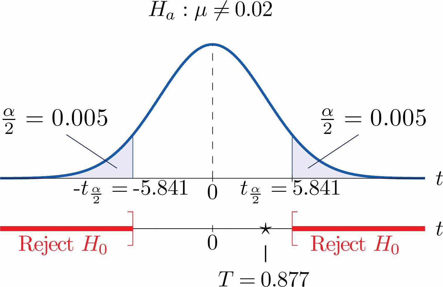 To perform the test in Note 8.43 "Example 11" using the p-value approach, look in the row in Figure 12.3 "Critical Values of " with the heading and search for the two t-values that bracket the value 0.877 of the test statistic. Actually 0.877 is smaller than the smallest number in the row, which is 0.978, in the column with heading t0.200. The value 0.978 cuts off a right tail of area 0.200, so because 0.877 is to its left it must cut off a tail of area greater than 0.200. Thus the p-value, which is the double of the area cut off (since the test is two-tailed), is greater than 0.400. Although its precise value is unknown, it must be greater than , so the decision is not to reject H0.