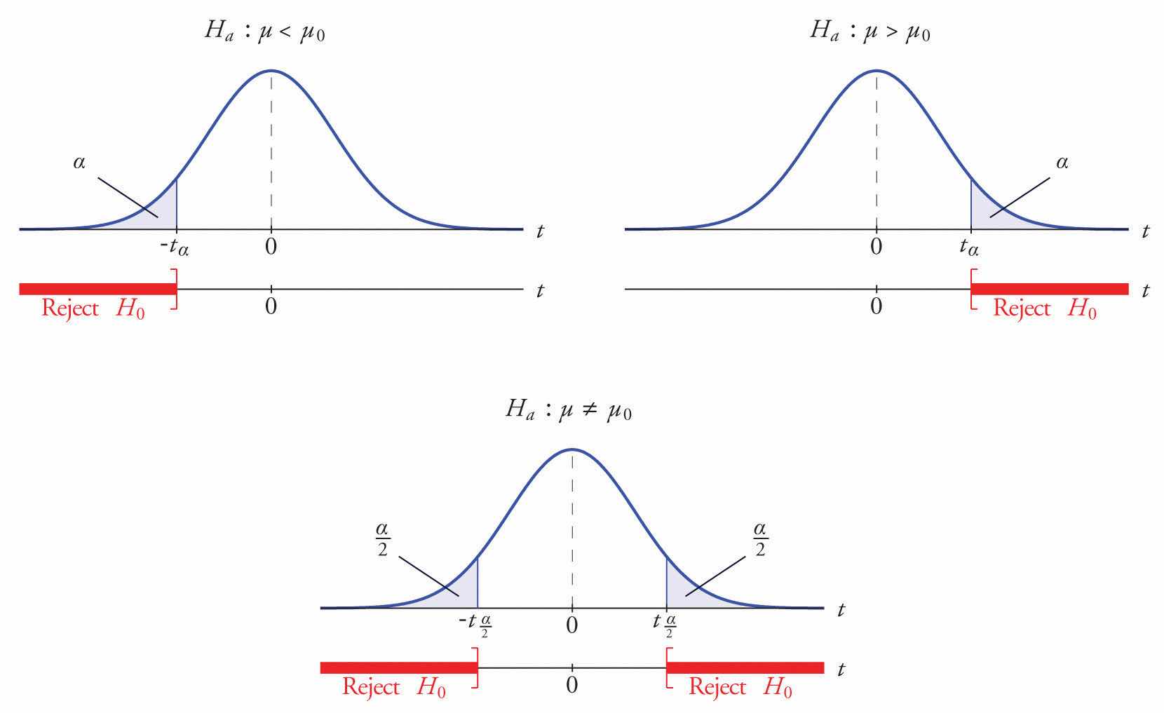 The distribution of the second standardized test statistic (the one containing s) and the corresponding rejection region for each form of the alternative hypothesis (left-tailed, right-tailed, or two-tailed), is shown in Figure 8.11 "Distribution of the Standardized Test Statistic and the Rejection Region". This is just like Figure 8.4 "Distribution of the Standardized Test Statistic and the Rejection Region", except that now the critical values are from the t-distribution. Figure 8.4 "Distribution of the Standardized Test Statistic and the Rejection Region" still applies to the first standardized test statistic (the one containing σ) since it follows the standard normal distribution.