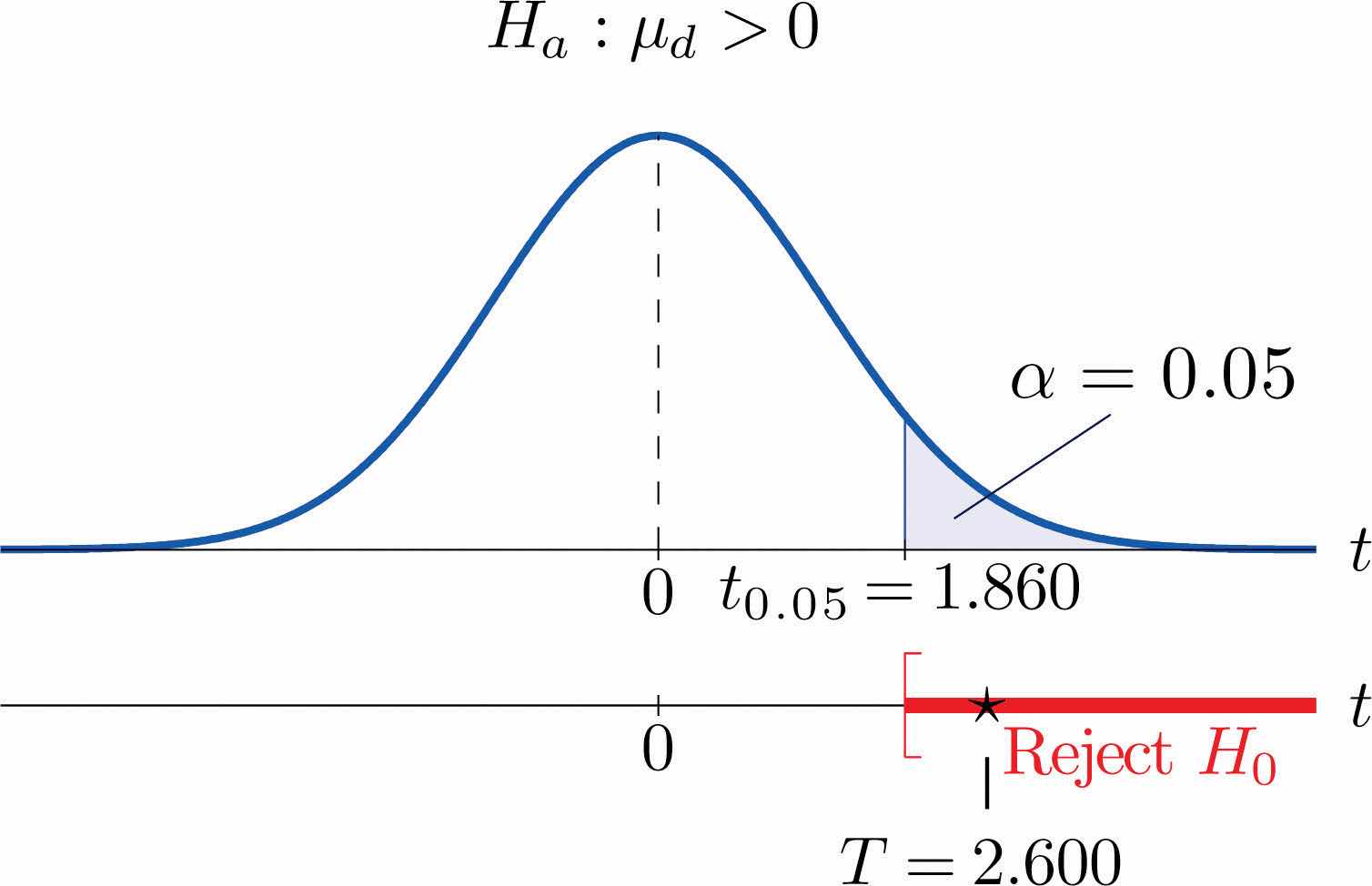 Testing hypotheses concerning the difference of two population means using paired difference samples is done precisely as it is done for independent samples, although now the null and alternative hypotheses are expressed in terms of instead of Thus the null hypothesis will always be written