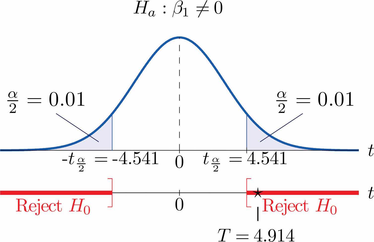 Figure 10.10 Rejection Region and Test Statistic for Note 10.34 "Example 9"