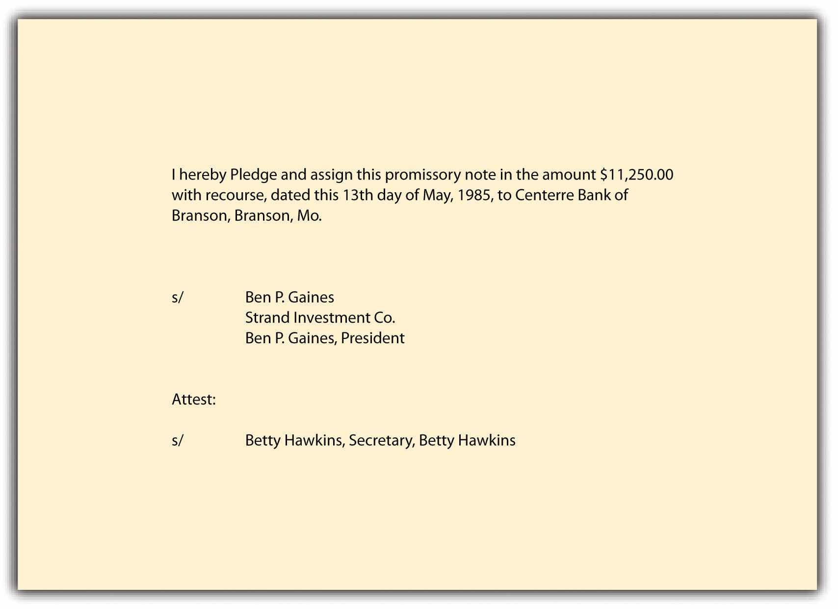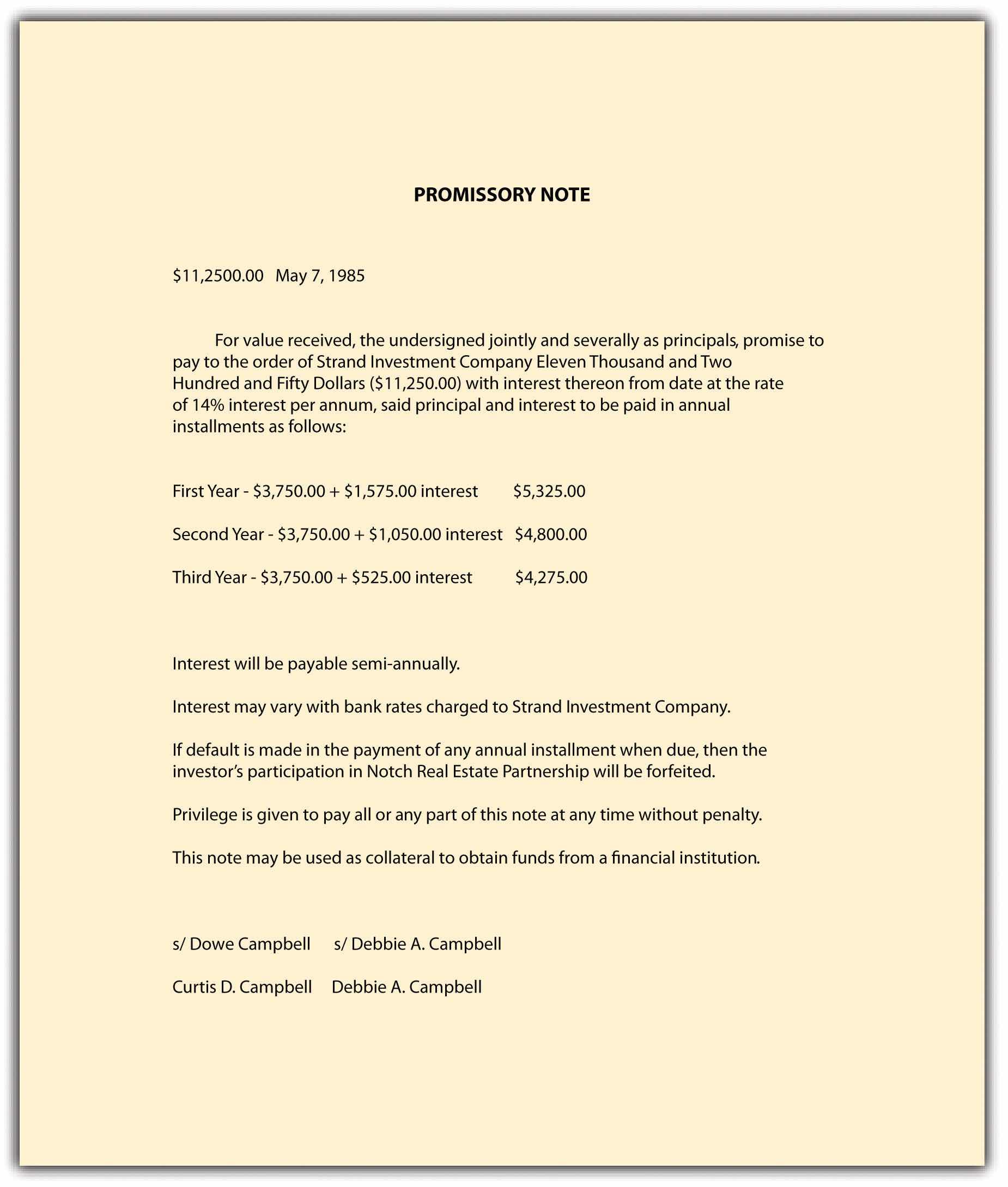A note—often called a promissory noteA written promise to pay or repay a specified sum of money at a stated time or on demand.—is a written promise to pay a specified sum of money on demand or at a definite time. There are two parties to a note: the makerA party that signs a promissory note. (promisor), and the payeeThe person who is to receive payment on a draft or note. (promisee). For an example of a promissory note, see Figure 22.4 "A Promissory Note". The maker might execute a promissory note in return for a money loan from a bank or other financial institution or in return for the opportunity to make a purchase on credit.