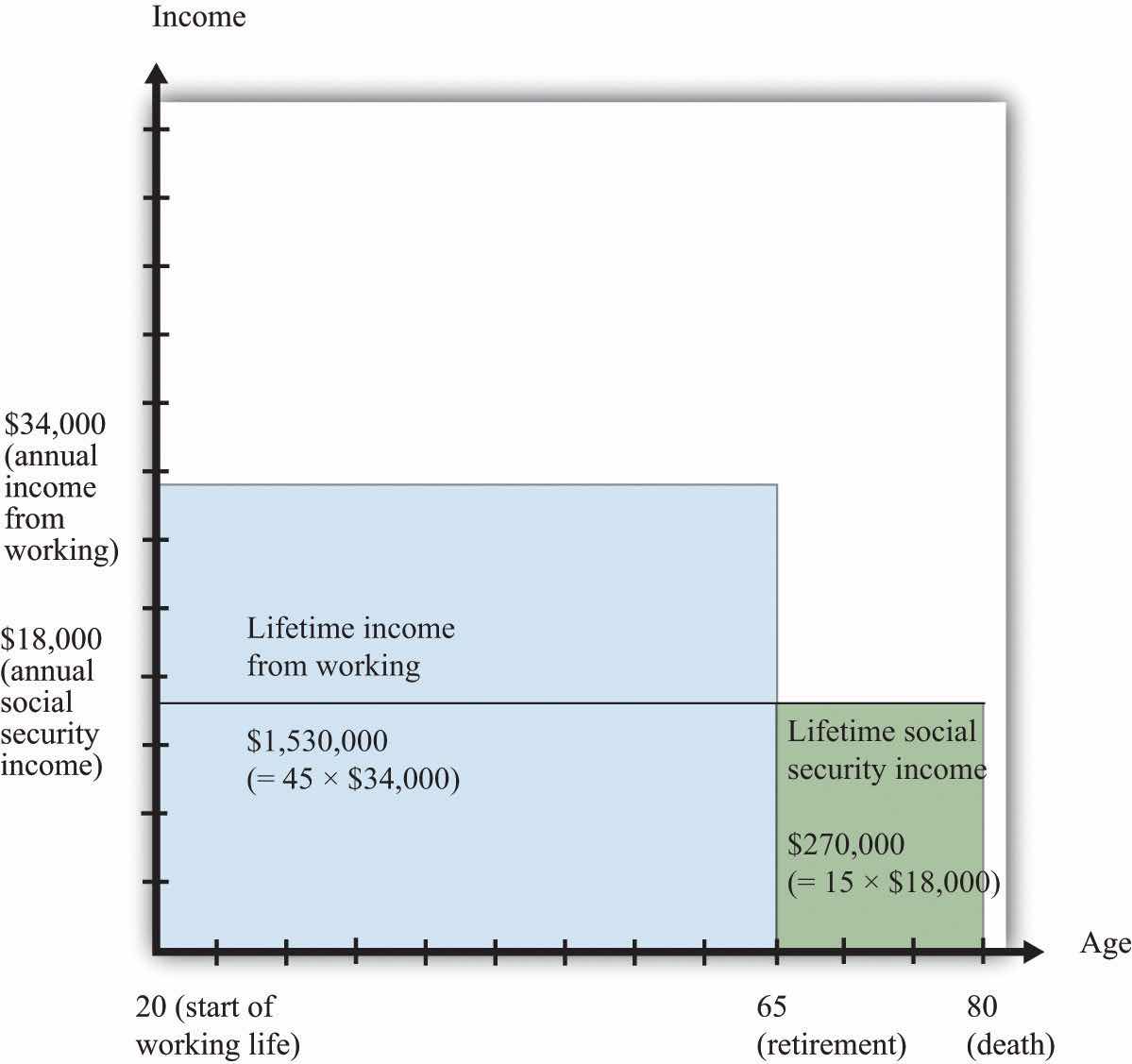 lifetime income = income during working years + income during retirement years = ($34,000 × 45) + ($18,000 × 15) = $1,530,000 + $270,000 = $1,800,000.Over his life, therefore, he has $1.8 million to spend. Figure 13.1 "Lifetime Income" shows his lifetime income. His total lifetime resources are obtained by adding together the two rectangles labeled “Lifetime Income from Working” and “Lifetime Social Security Income.” The height of each rectangle gives his income, and the width of each rectangle gives the number of years for which he earns that income.
