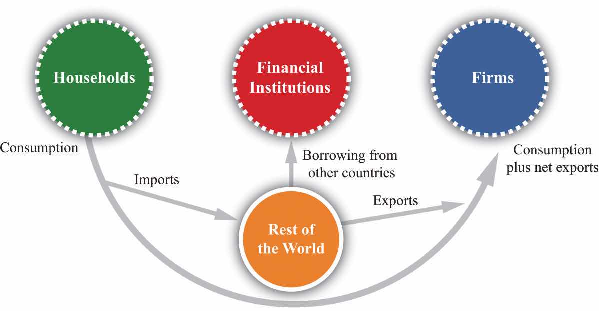 Households purchase goods from other countries; these are called imports. Citizens of other countries purchase our products; these are called exports. A trade deficit requires borrowing from the rest of the world.