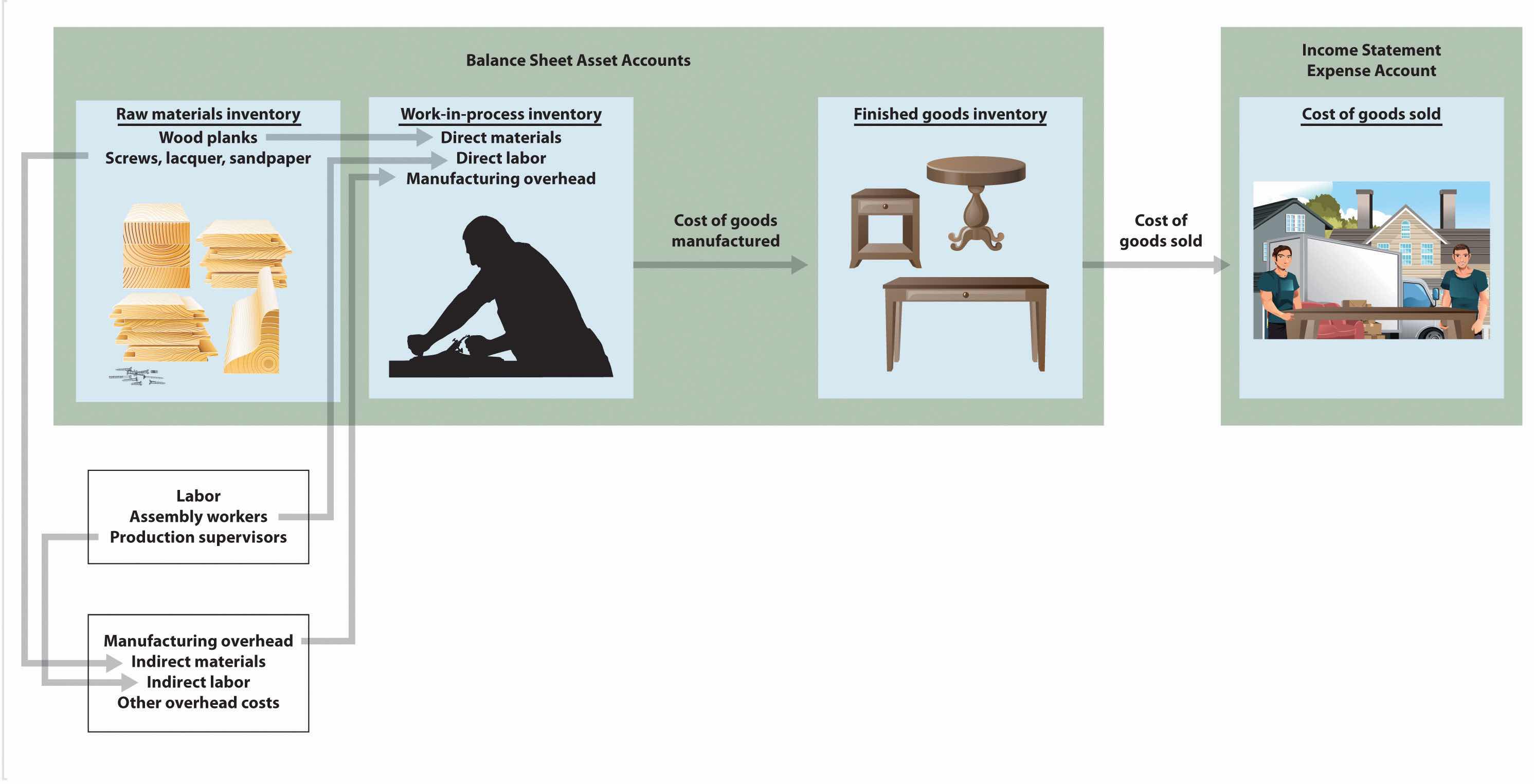 For example, suppose Custom Furniture Company sells one table that cost $3,000 to produce (i.e., direct materials, direct labor, and manufacturing overhead costs incurred to produce the table total $3,000). The $3,000 cost is in finished goods inventory until the entry is made to record the sale, at which time finished goods inventory is reduced by $3,000 (the table is no longer in inventory) and cost of goods sold is increased by $3,000.