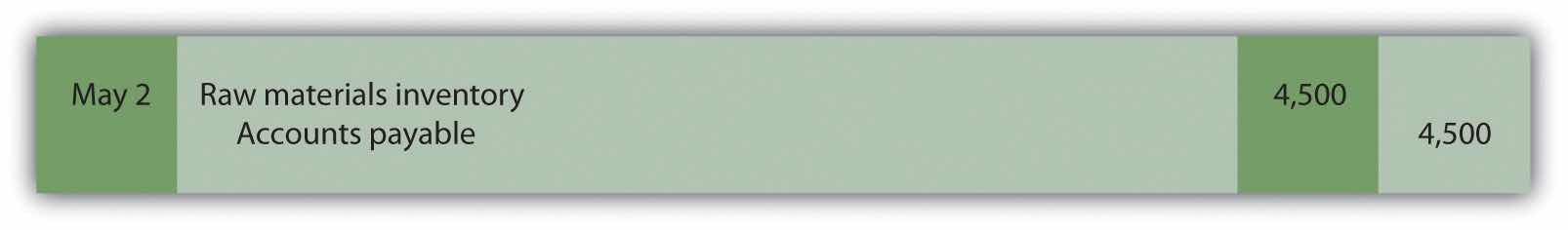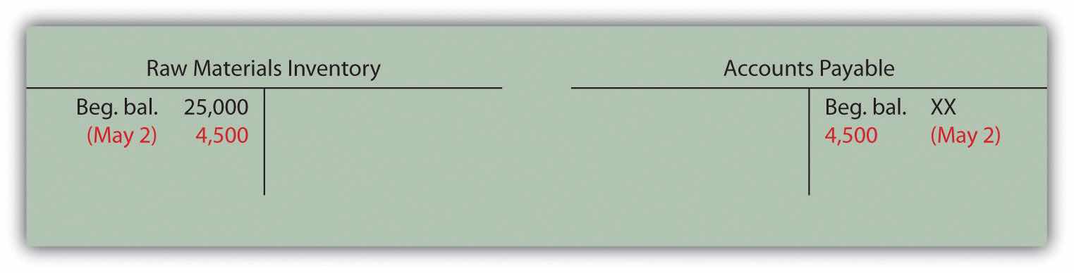 Answer: The accountants at Custom Furniture record the cost of raw materials purchased in the raw materials inventory account. Assume Custom Furniture Company purchased $4,500 in raw materials on May 2. All purchases are on account. The journal entry to reflect this transaction is as follows: