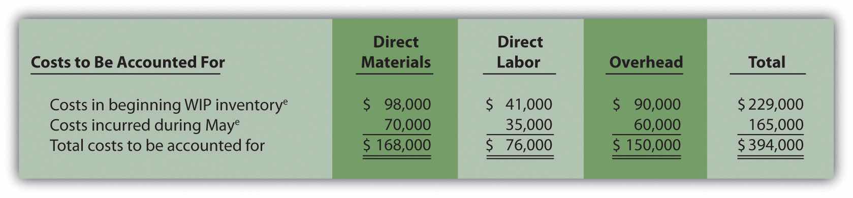 Answer: The total costs to be accounted for include the costs in beginning WIP inventory and the costs incurred during the period. Figure 4.5 "Summary of Costs to Be Accounted for in Desk Products’ Assembly Department" shows these costs for the Assembly department. Notice that the costs are separated into direct materials, direct labor, and overhead.