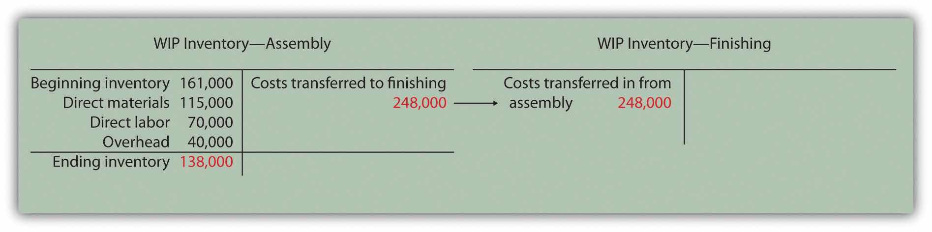 Figure 4.7 "Assigning Costs to Products in Desk Products’ Assembly Department" shows that total costs of $248,000 are assigned to units completed and transferred out and that $138,000 in costs are assigned to ending WIP inventory.
