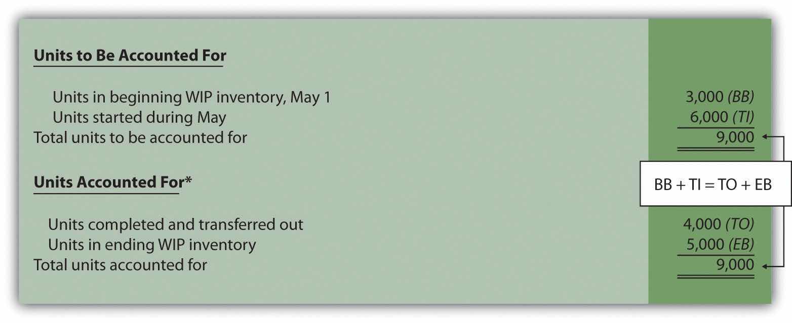 This step shows that 3,000 units were in WIP inventory on May 1 and 6,000 units were started during May. Thus 9,000 units must be accounted for. These 9,000 units will end up in one of two places, either completed and transferred out (to the Finishing department) or not completed and therefore in ending WIP inventory. The previous schedule shows that 4,000 units were completed and transferred out (3,000 from beginning WIP inventory and 1,000 from the units started and completed during the month), and 5,000 units remain in ending WIP inventory.