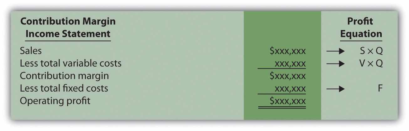 Figure 6.1 "Comparison of Contribution Margin Income Statement with Profit Equation" clarifies the link between the contribution margin income statement presented in Chapter 5 "How Do Organizations Identify Cost Behavior Patterns?" and the profit equation stated previously. Study this figure carefully because you will encounter these concepts throughout the chapter.
