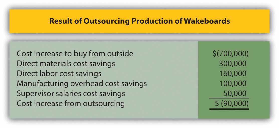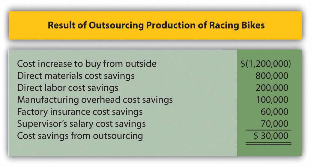 Outsourcing production eliminates all variable production costs, the production supervisor’s salary, and factory insurance costs. Factory building and equipment lease costs will remain the same regardless of the decision to outsource or to produce internally.