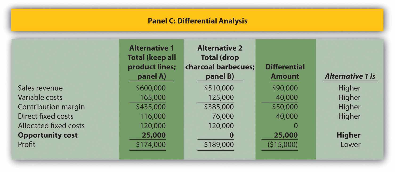 Opportunity costs can also be included in the differential analysis format presented in Figure 7.6 "Product Line Differential Analysis for Barbeque Company". Panel C of Figure 7.6 "Product Line Differential Analysis for Barbeque Company" is simply modified to reflect the opportunity cost, as shown.