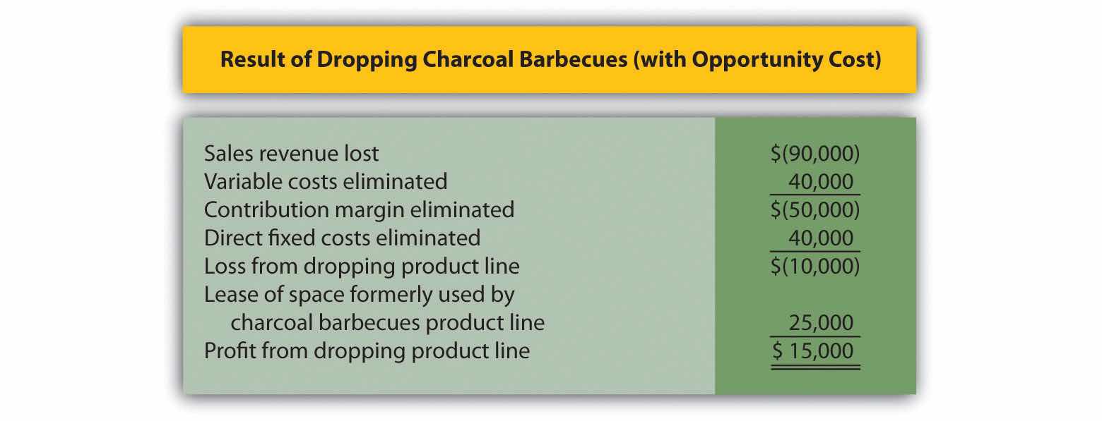 Figure 7.7 "Summary of Differential Analysis for Barbeque Company" shows that Barbeque Company will lose sales revenue of $90,000 if it drops the charcoal barbecues product line. However, it saves variable costs of $40,000 and direct fixed costs of $40,000 if it drops the charcoal barbecues product line. Because the $80,000 in cost savings is not enough to make up for the $90,000 loss in sales revenue, profit will decline by $10,000 (= $80,000 − $90,000).