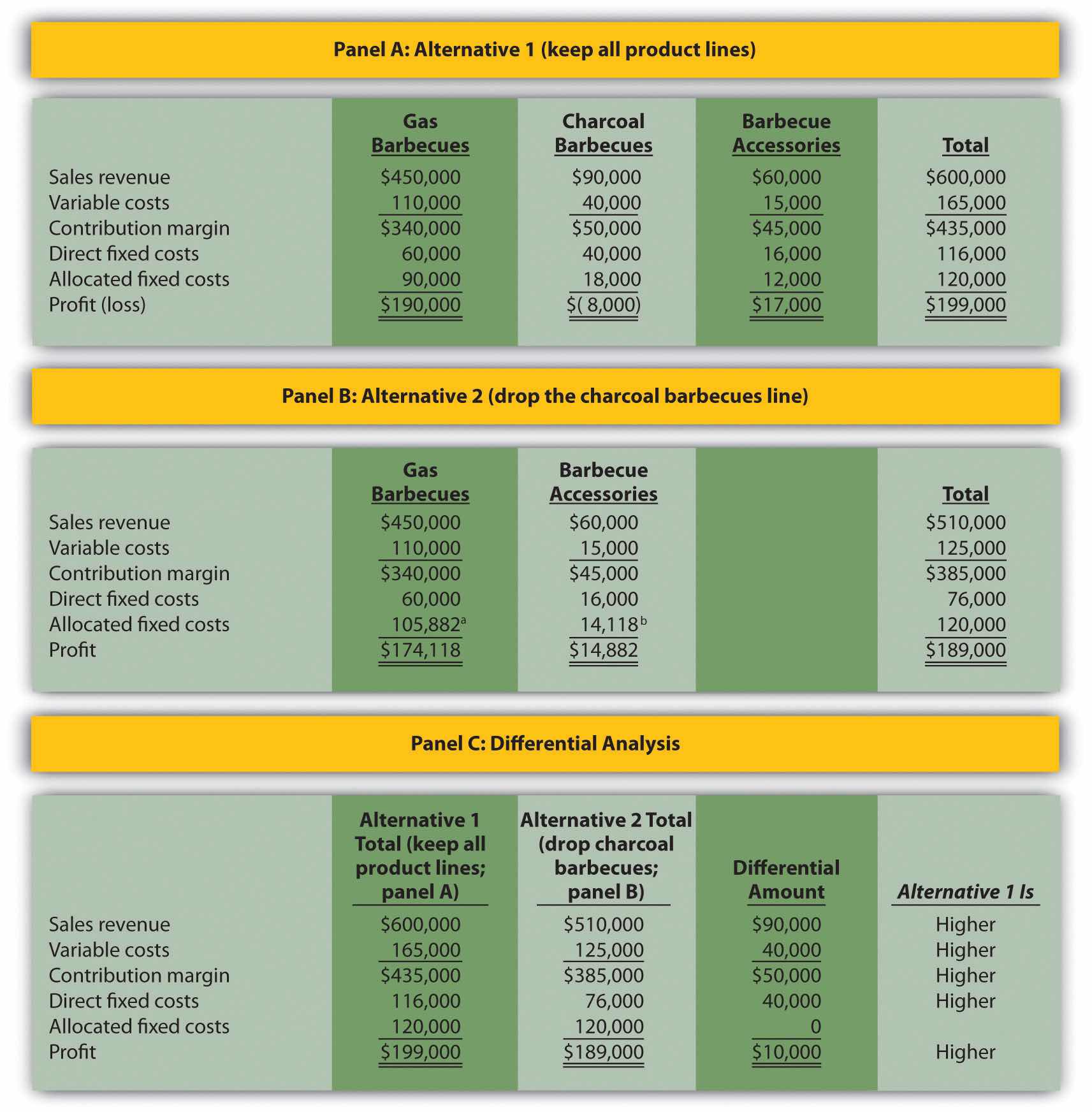 Answer: The differential analysis presented in Figure 7.6 "Product Line Differential Analysis for Barbeque Company" provides the answer. Panel A shows the income statement for Alternative 1: keeping all three product lines. Panel B shows the income statement for Alternative 2: dropping the charcoal barbecues product line. And panel C presents the differential analysis for the two alternatives. The differential analysis in panel C shows that overall profit will decrease by $10,000 if the charcoal barbecue product line is dropped.