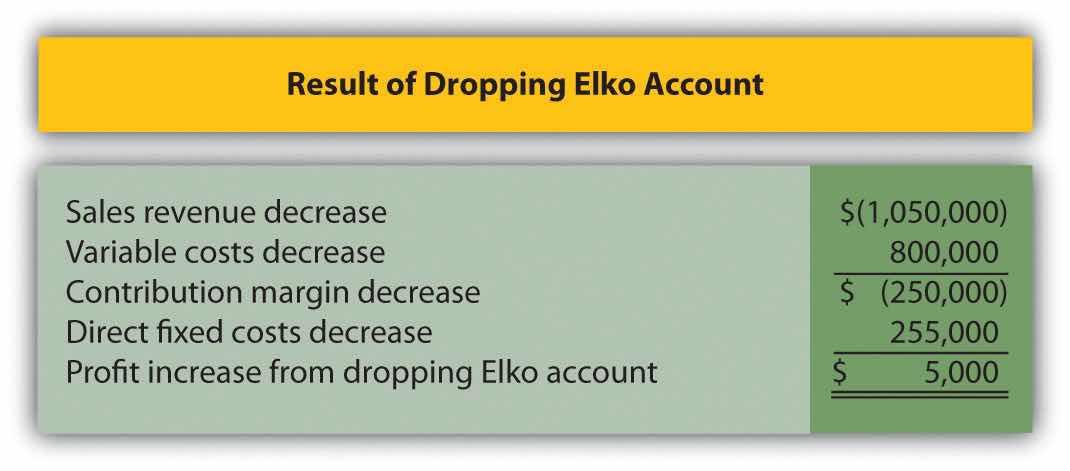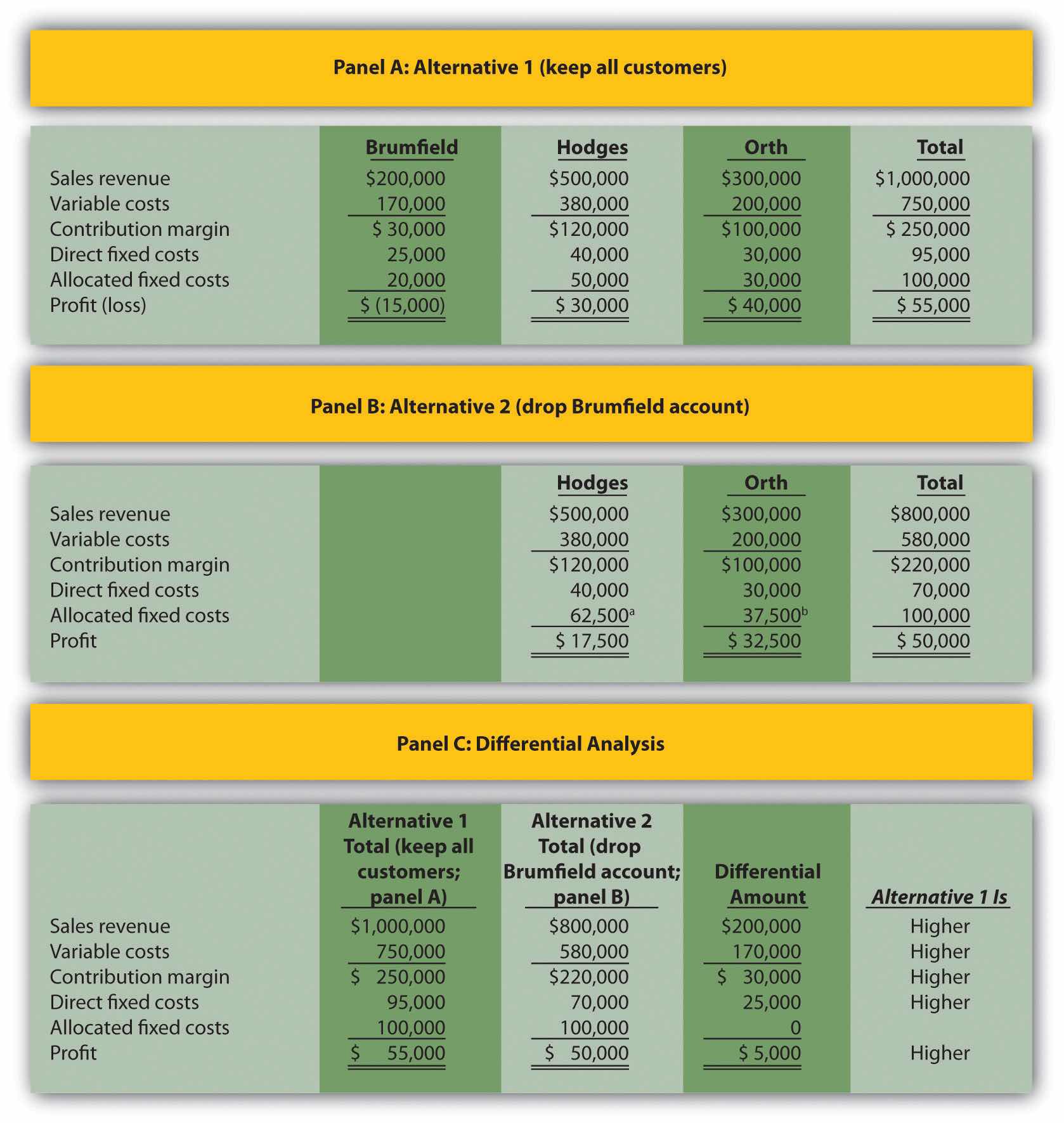 Answer: To answer this question we must take a closer look at the information in Figure 7.9 "Income Statement for Colony Landscape Maintenance". The variable costs and direct fixed costs are related directly to each customer, and thus are eliminated if Colony eliminates the Brumfield account. That is, all variable costs and direct fixed costs are differential costs for the two alternatives facing Colony. Colony assigns the allocated fixed costs of $20,000 to Brumfield based on sales revenue, and those costs will continue regardless of Colony’s decision. Thus allocated fixed costs are not differential costs.