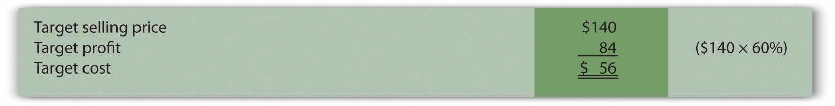 The target cost of $56 is found by subtracting the target profit from the target selling price. This calculation is as follows.