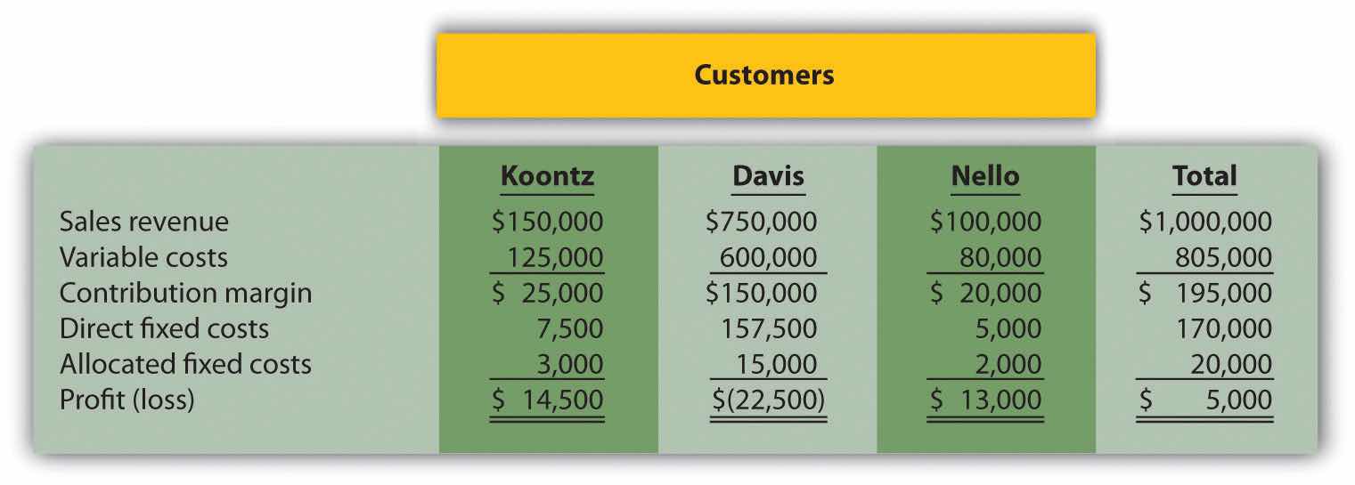 Management is concerned about the significant losses associated with the Davis account and would like to drop this customer. Allocated fixed costs are assigned to customers based on sales revenue. If Davis is dropped, total allocated fixed costs are assigned to the remaining customers, and all variable and direct fixed costs for the Davis account will be eliminated.