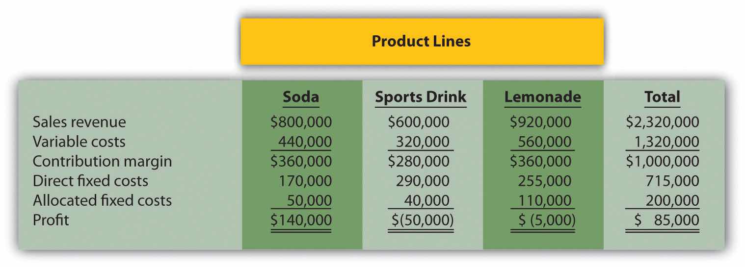 Management is concerned about the losses associated with the sports drink and lemonade product lines and is considering dropping all product lines except soda. Allocated fixed costs are assigned to product lines based on direct labor hours associated with each product line resulting in the following percentages for soda, sports drink, and lemonade, respectively: 25 percent, 20 percent, and 55 percent. If the sports drink and lemonade product lines are eliminated, total allocated fixed costs will decrease by $40,000, and variable costs and direct fixed costs for these two product lines will be eliminated. (No allocated fixed cost savings occur if only one product line is dropped.)