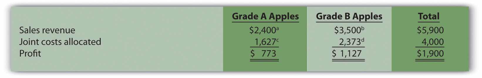 c $1,200 = $4,000 joint costs × (3,000 pounds of Grade A apples ÷ 10,000 total pounds).