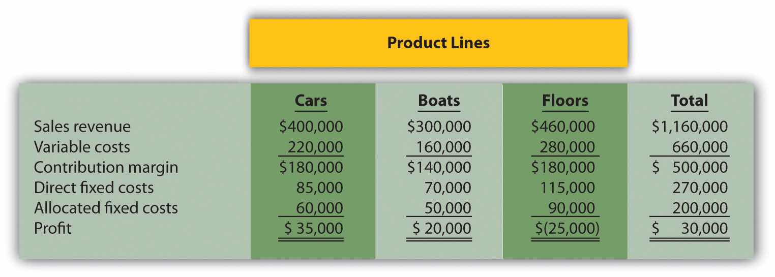 Management is concerned about the loss associated with the floors product line and is considering dropping this product line. Allocated fixed costs are assigned to product lines based on direct labor hours associated with each product line, resulting in the following percentages for cars, boats, and floors, respectively: 30 percent, 25 percent, and 45 percent. If the floors product line is eliminated, total allocated fixed costs will be assigned to the remaining products as follows: 55 percent to cars, and 45 percent to boats. All variable and direct fixed costs for the floors product line will be eliminated.