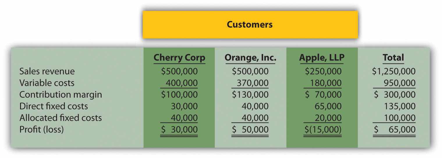 Management is concerned about the losses associated with the Apple LLP account and would like to drop this customer. Allocated fixed costs are assigned to customers based on sales revenue. If Apple LLP is dropped, total allocated fixed costs are assigned to the remaining customers, and all variable and direct fixed costs for the Apple LLP account will be eliminated.