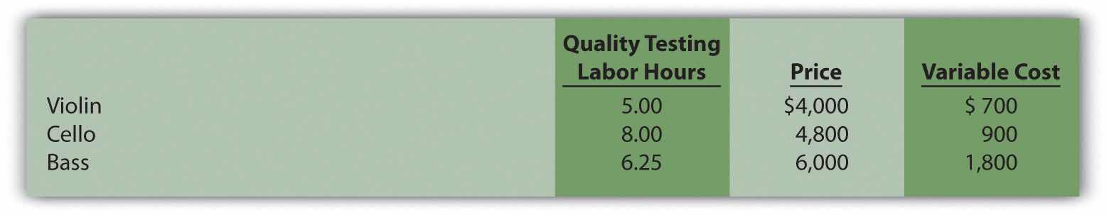 Constrained Resources. Instrumental Strings, Inc., produces three types of string instruments: violin, cello, and bass. The instruments are produced in separate departments and sent to the quality testing department before being packaged and shipped. A labor-hour bottleneck has been identified in the quality testing department due to the high skill requirements of the job. Instrumental Strings would like to optimize its use of labor hours by producing the two most profitable instruments. Information for each product follows.
