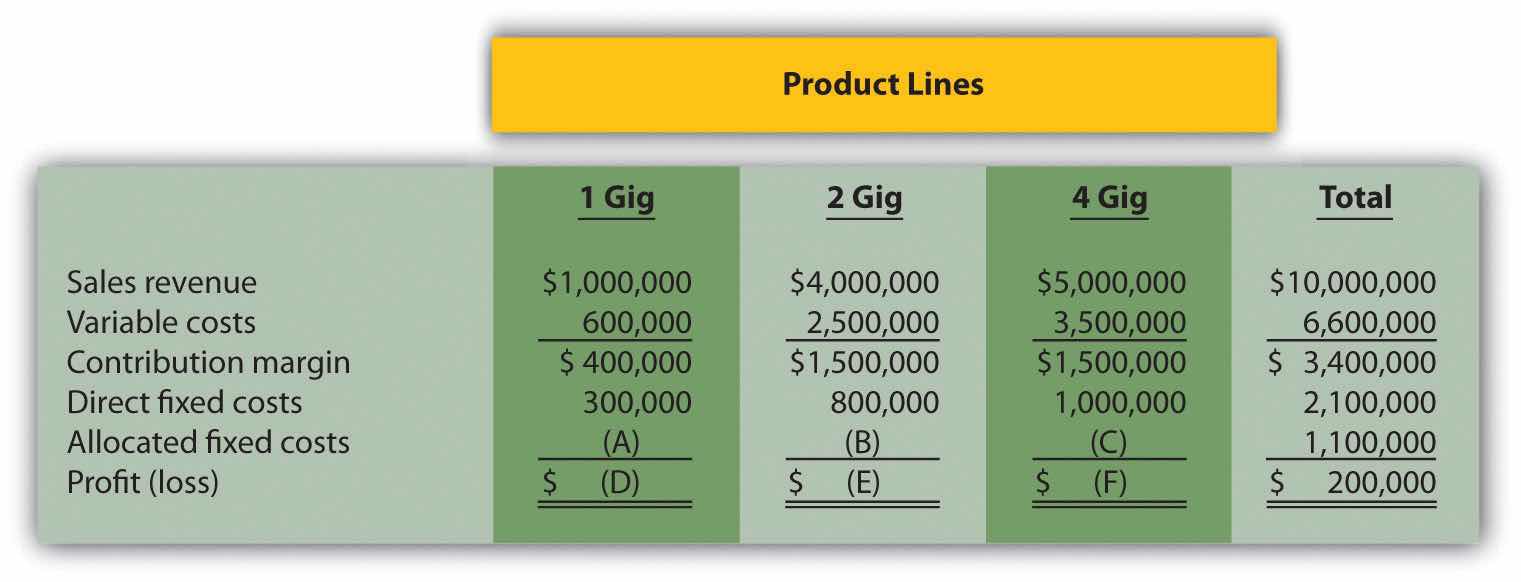 For items A, B, and C, assign allocated fixed costs to each product line based on sales revenue for each product line as a proportion of total sales revenue. For example, the 1 Gig product will be assigned 10 percent of allocated fixed costs (= $1,000,000 in 1 Gig sales revenue ÷ $10,000,000 total sales revenue), or $110,000 (=$1,100,000 total allocated fixed costs × 10 percent). For items D, E, and F, calculate the profit or loss for each product line.
